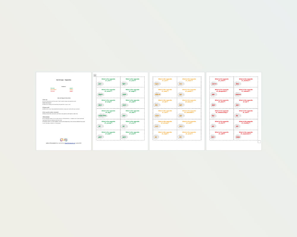 36 kartiček ‚opaků‘ rozdělených barevně do tří úrovní podle obtížnosti. Na principu Ask & Swap se žáci navzájem zkouší a tím si osvojují přídavná jména. Barvy vyjadřují úroveň, kterou si buď žáci sami vybírají nebo je určena učitelem, což umožňuje téma diferencovat. Aktivitu VYŘEŠ A PROHOĎ si můžete vyzkoušet na mém semináři ZÁSOBNÍK AKTIVIT UČITELE AJ.