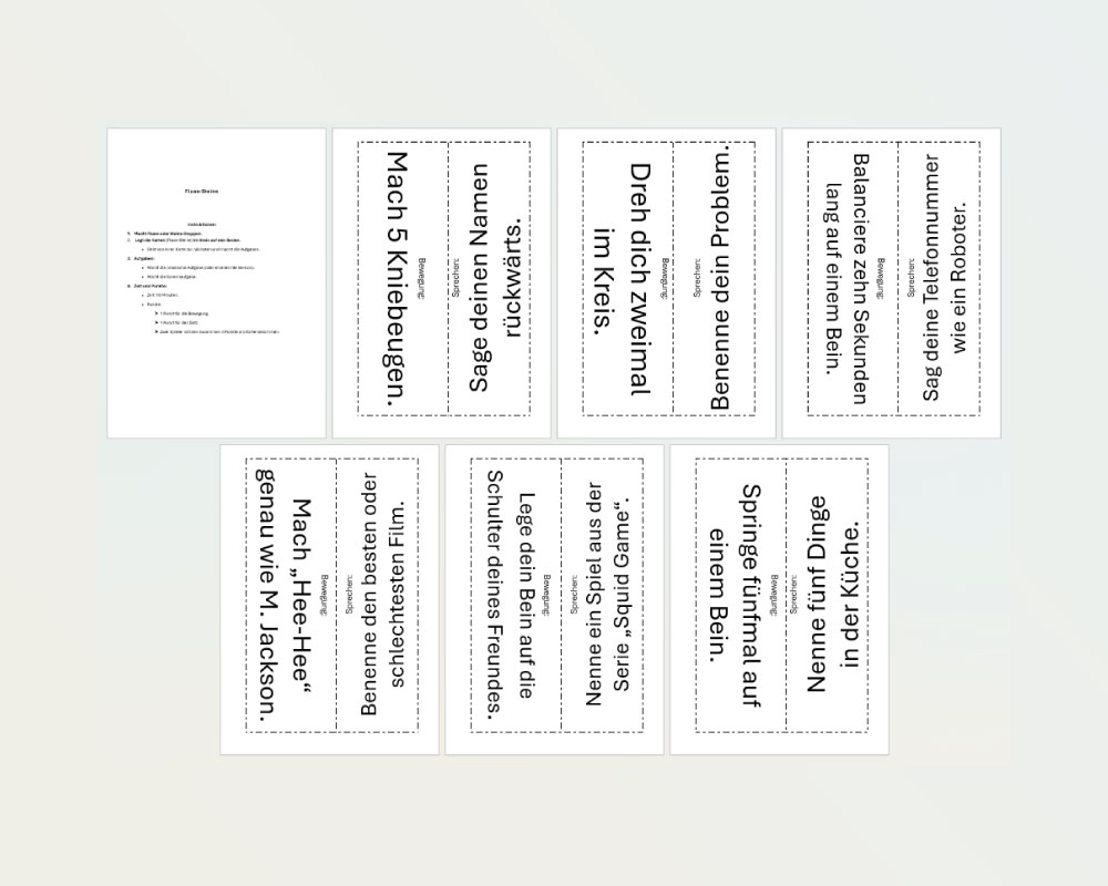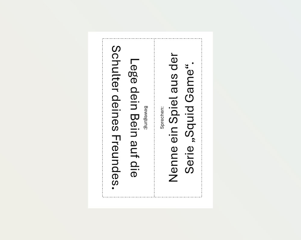 Dvojice se posouvají od stanoviště ke stanovišti a vybírají si úkoly, které splní. Na výběr mají buď pohybové anebo jazykové výzvy. Materiál obsahuje sadu celkem šesti karet vždy po dvou výzvách.