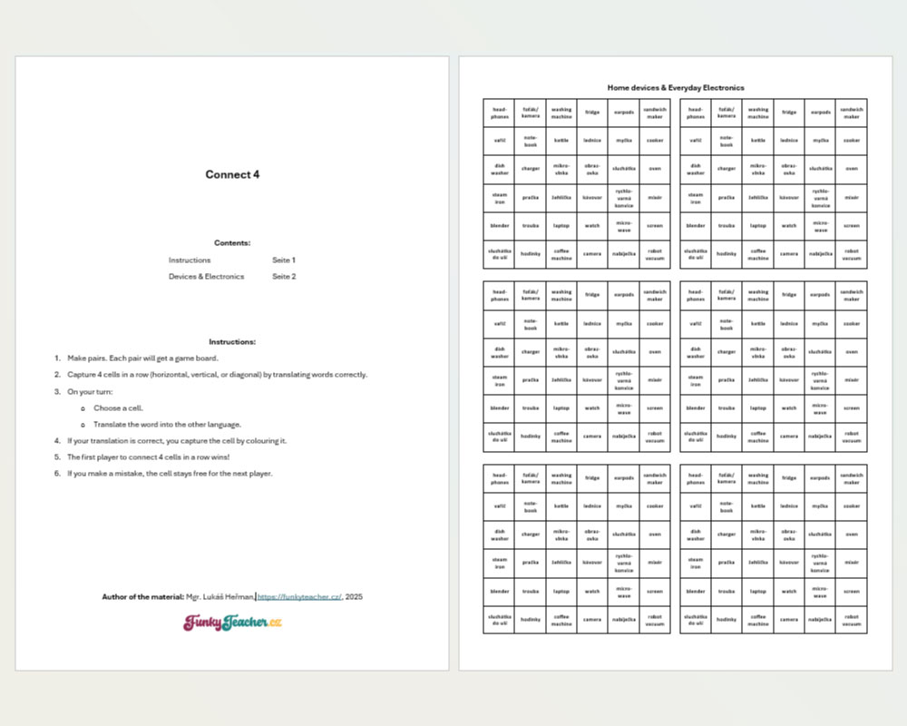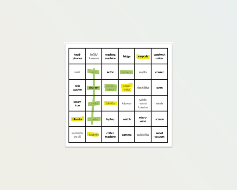- Šablonu 6×6 buněk, 6 na A4 obsahující téma Devices & Electronics
